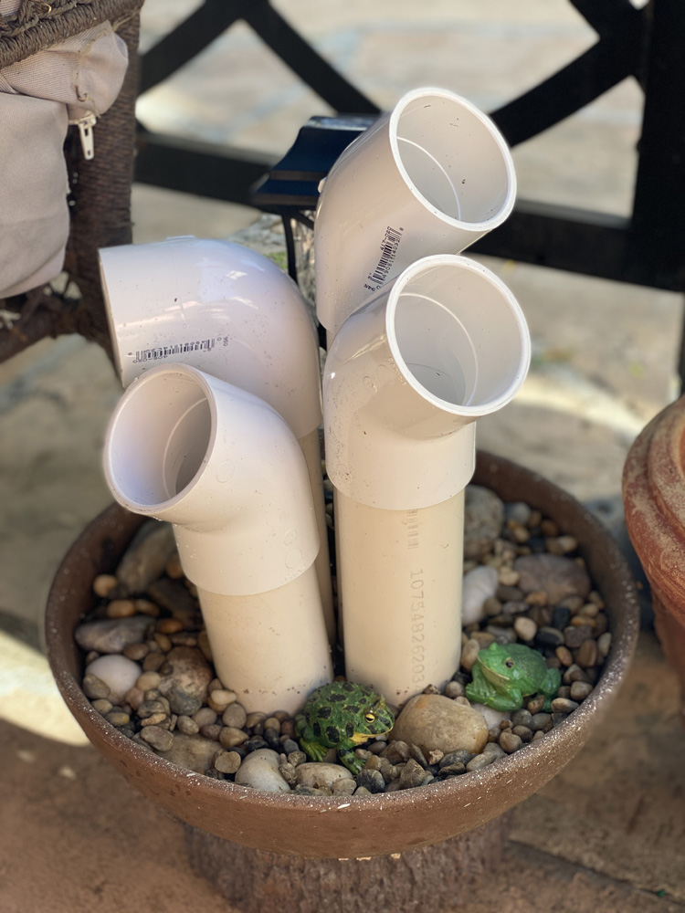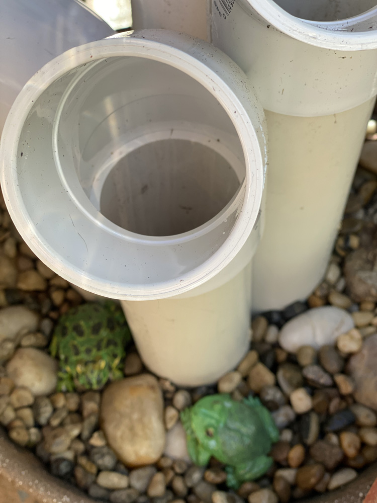 We already had a piece of PVC pipe and a shallow pot, so we picked up a few of the PVC elbows at Home Depot and made our own! We transported one frog to it already! There is also a solar light to attract bugs for the frogs at night.
