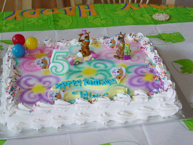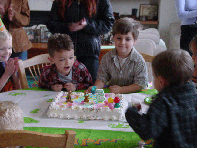 In line for the pinãta. Patiently waiting... Kyle Tyler takes a swing. That's one tough pinãta! Finally...some candy! Pat and Brett Scotty Here comes the cake! That's one cool Scooby cake! Yummy cake! Reilly and Tyler