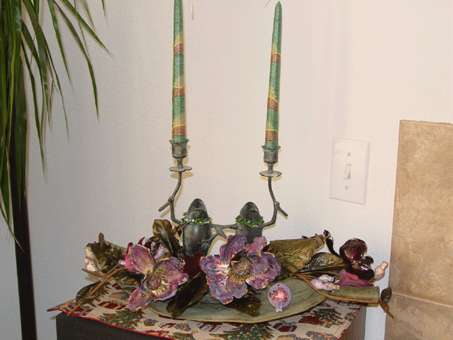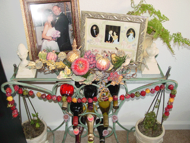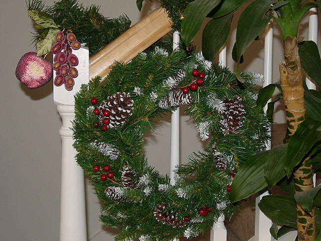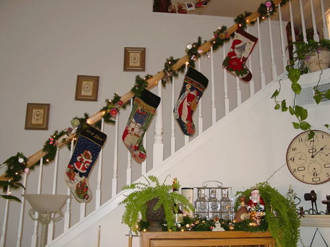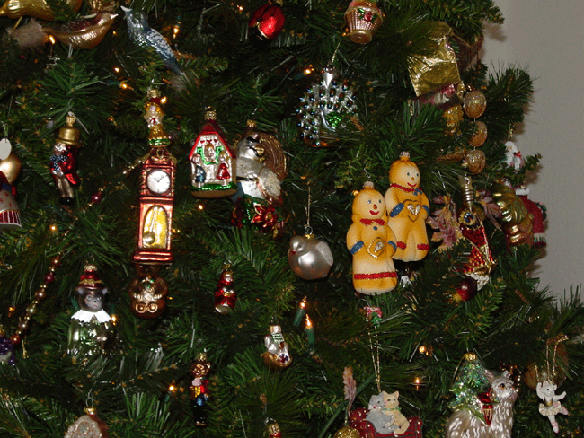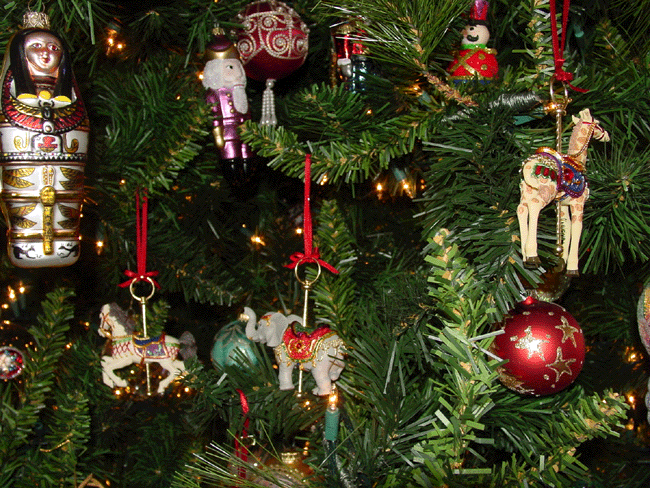 Egyptian ornaments. Gingerbread couple. Carousel animals. Martini and more... Glass maple leaf, butterfly, etc. Radko moon and sun. Snow dusted wreath. Partridge in a pear tree candelabra. Top of wine table. Collection of Christmas globes. Angel. Top of sofa table.. Dancing frogs. Stockings. Top of liquor cabinet.