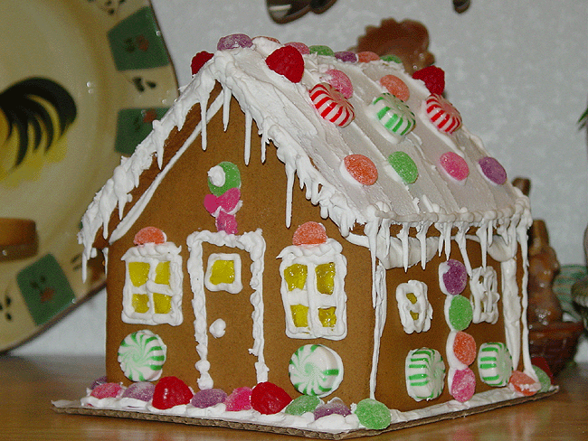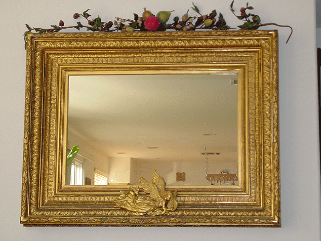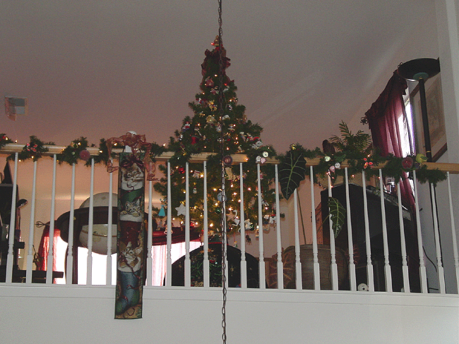 Christmas music box. Mirror in livingroom. Fruit tree Heidi made. Miniature tree Heidi made. Santa and deer upstairs. Hallway with garland and beaded fruit. Mini tree with little ornaments. Mini tree with train. Rudolph-topped tree in loft. Another view of tree in loft. Gingerbread house Heidi made! Another view.