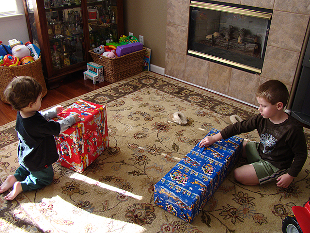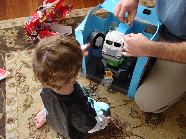 December 24, 2010The boys each got to pick out a present to open today. We usually make them wait until Christmas Eve, but we let them open them in the afternoon so they would have more time to play. Hunter had a blast finding change outside with his new metal detector, and Ryder just loved "Stinky" the garbage truck. Dave also built Ryder's train table to get it ready for tomorrow. All the presents are in place, cookies are out for Santa and we are ready for Christmas day! Click any image for larger view.