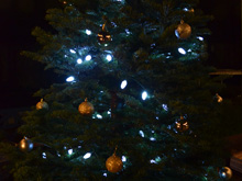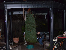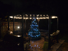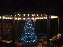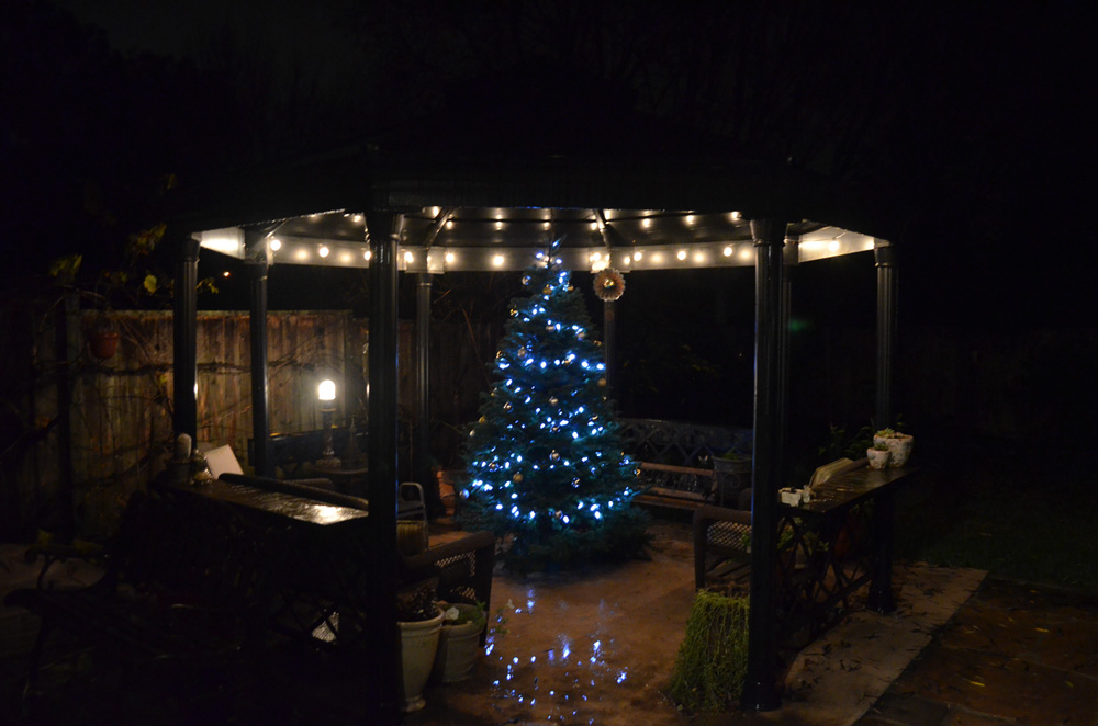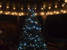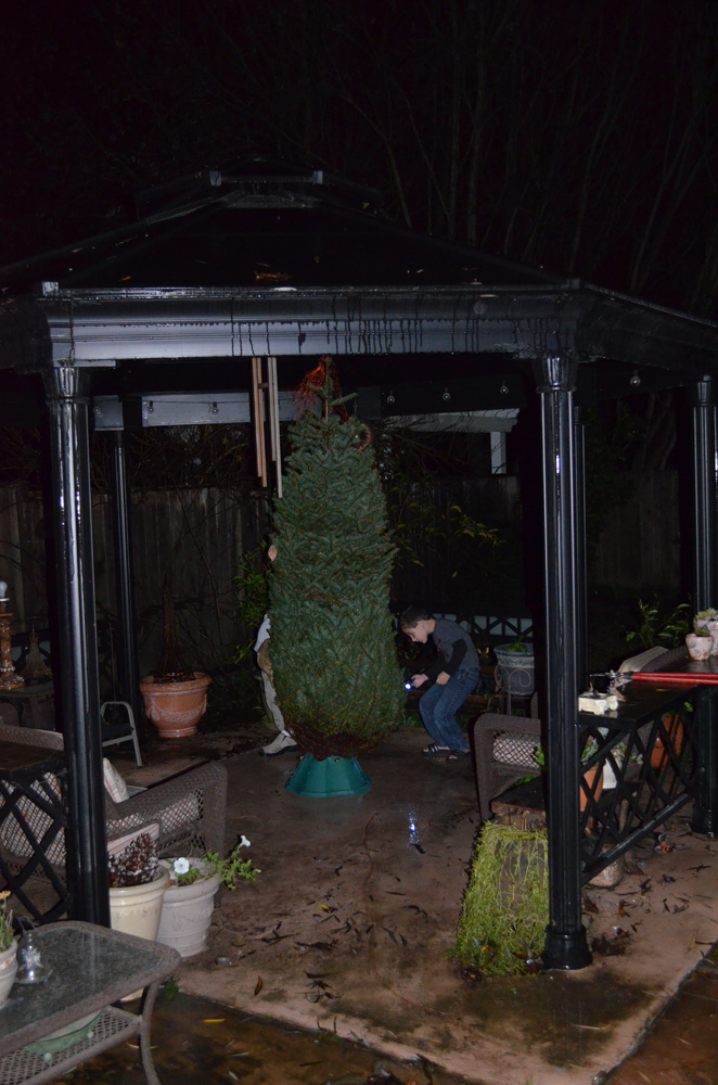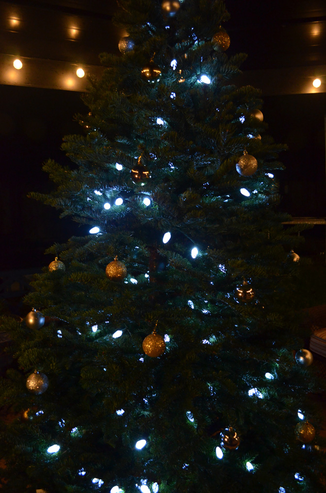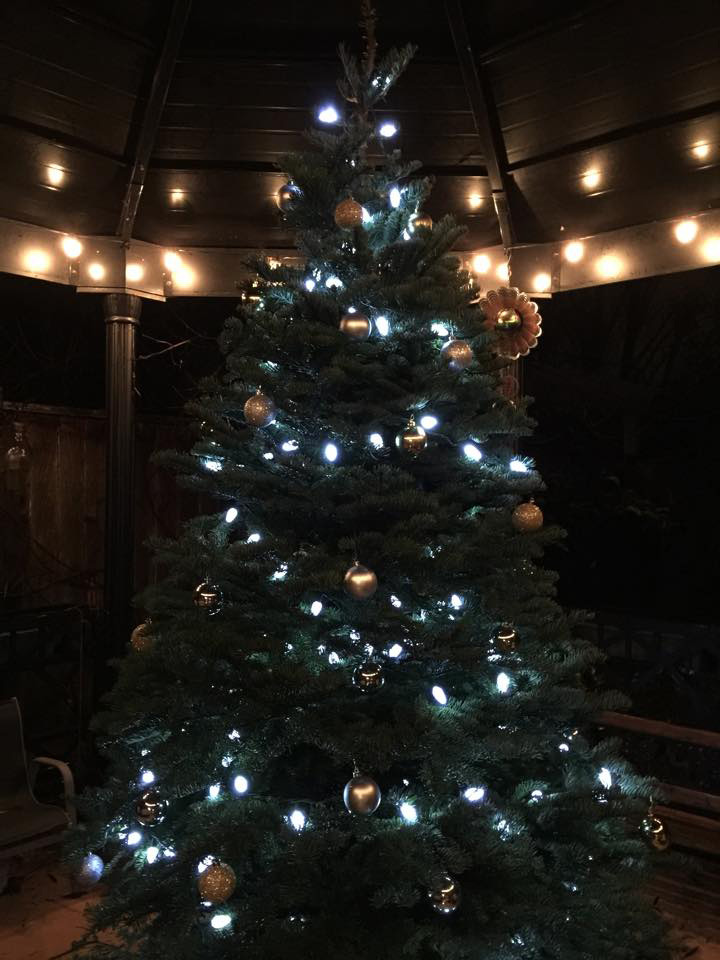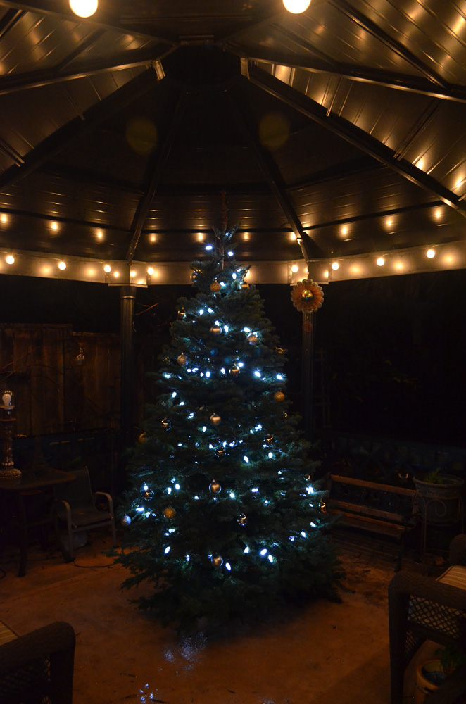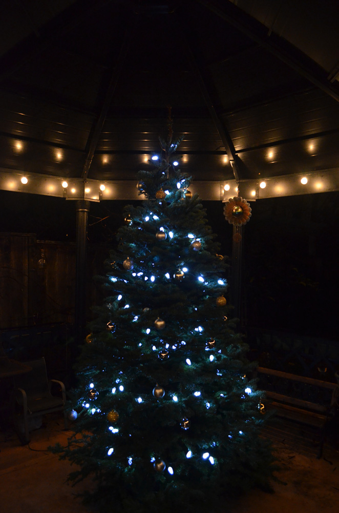 This year we decided to get a Christmas tree for the Gazebo. We went to Home Depot and picked up a 7-foot Noble Fir tree, a nice set of LED lights, a tree stand and two boxes of shatterproof ornaments in gold and silver for under $100. It looks so pretty in the center of the gazebo!