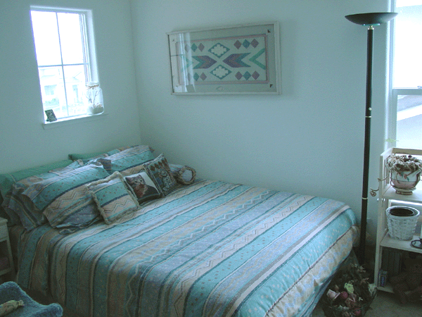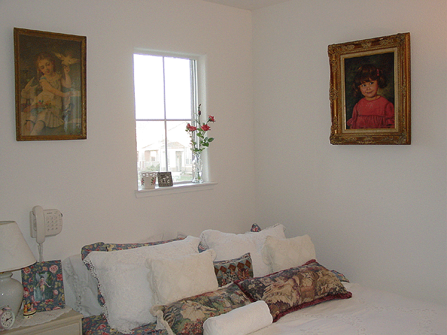 Victorian-style bedding. Cute accessories... Shelves Dave put up for me. New curtain. Picture I framed from a calendar. Another framed calendar picture. Lots of cat-inspired touches...this is Allie's room! This old painting by Heidi's mom fits perfectly in our new guest room!