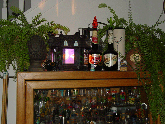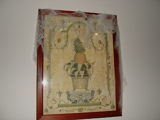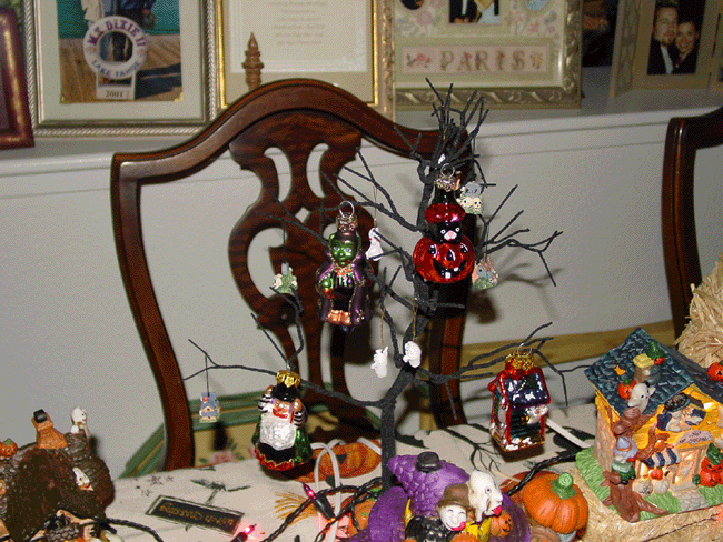 Haunted House Liquor cabinet Halloween candles. Spooky stuff! Front window. Heidi's pumpkin. Halloween village in the dark. Halloween village. Halloween tree. Halloween ornaments. Lots of candy...but it wasn't enough! Cobwebs! Web-covered print. Fiberoptic pumpkin. Happy witch.