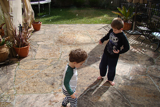 February 25, 2011We had hail today. It lasted for a while, and started to become softer ice like snow. It is supposed to snow here tonight, but we'll see. The boys had fun playing in this light ice flurry!