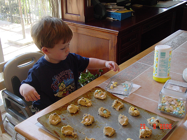 August 29, 2006Dave had to work late tonight, so Heidi and Hunter went to the park and made M&M cookies. Click any image for larger view.