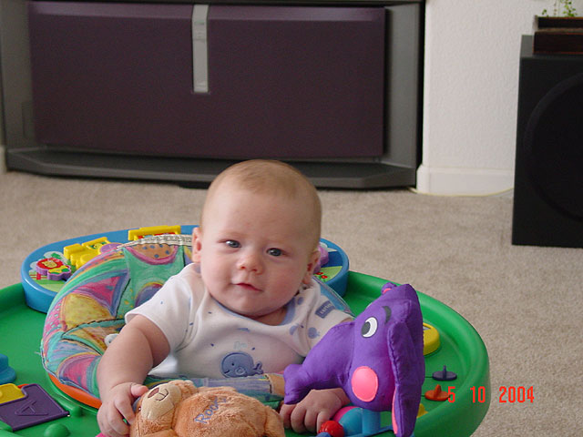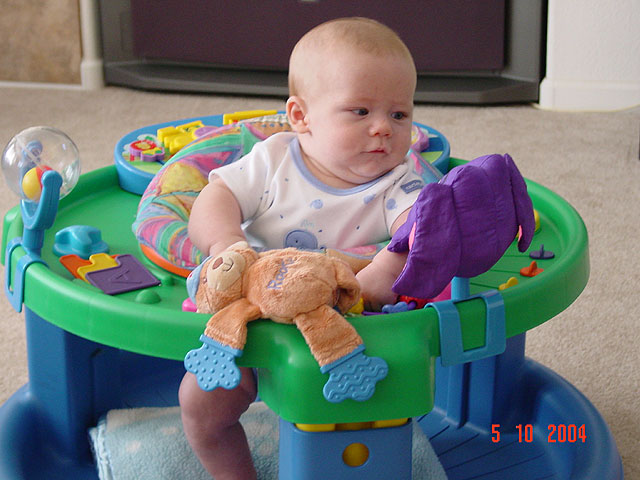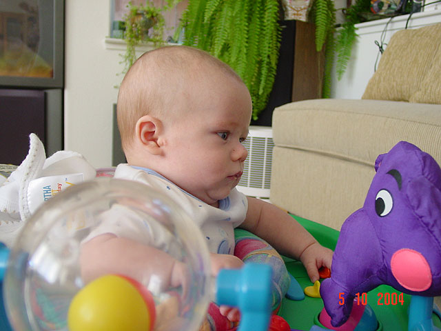 Hunter gets to play in the exersaucer. Hunter plays with his toys. Hunter is proud of himself because he is big enough to play in his saucer. Showing his double chin... Hunter gets serious about his doggie teether... Hunter likes the purple elephant. Hunter still busy...