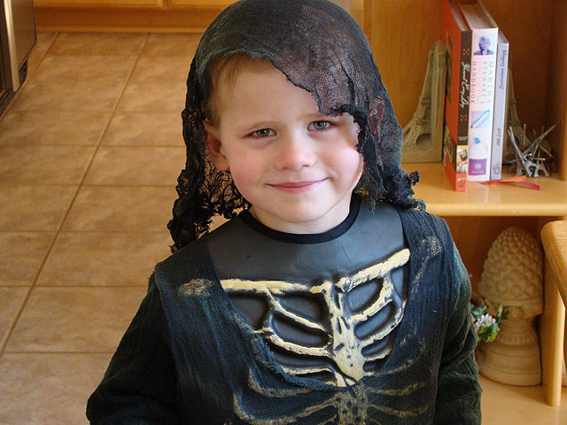 Hunter was going to be Indiana Jones, but we couldn't find a costume in his size. He decided on a skeleton pirate. He tried it on today and loves it!