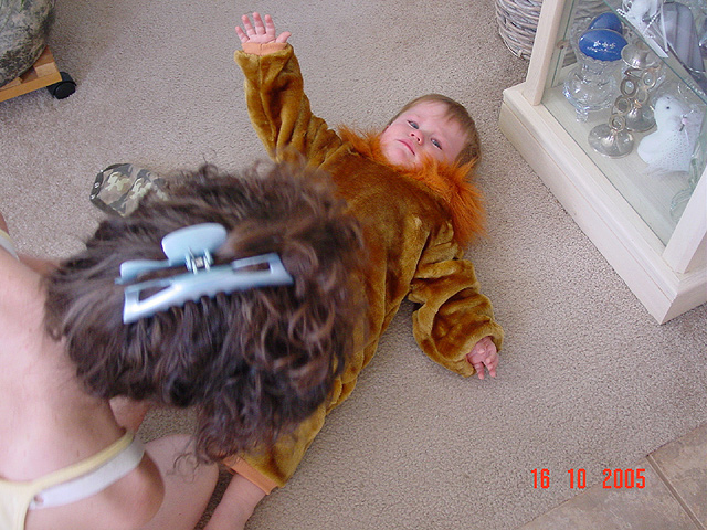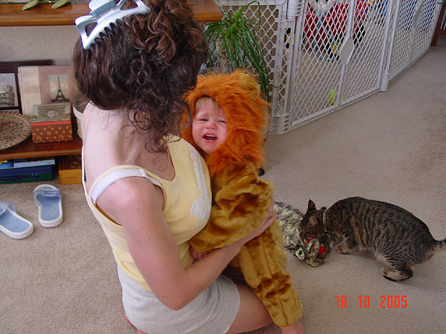 Hunter loves Lions, so we thought this was a good choice for his Halloween costume. We tried it on him on a pretty warm day, and he didn't seen to fond of it! Hopefully, Halloween will be a cool night!