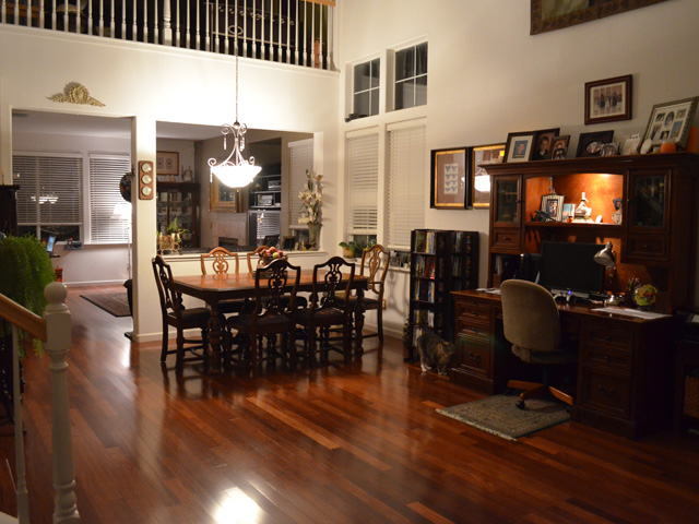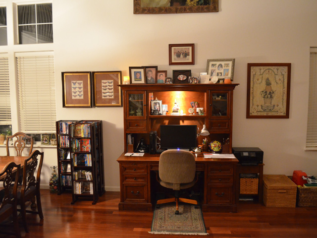 Our computer desk is very big and did not fit well where we had it between the kitchen and living room. Since we no longer have the pool table in the front room, it was pretty empty and had almost no furniture. We decided to move the desk in the front room -- which looks great! It also gives us so much more space around our kitchen table.