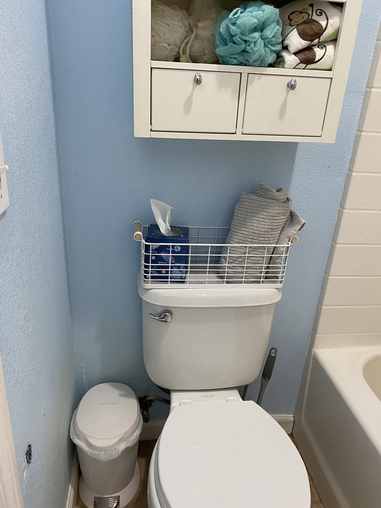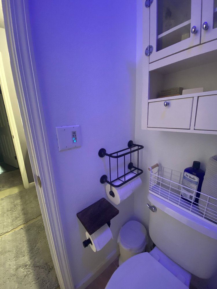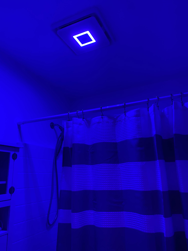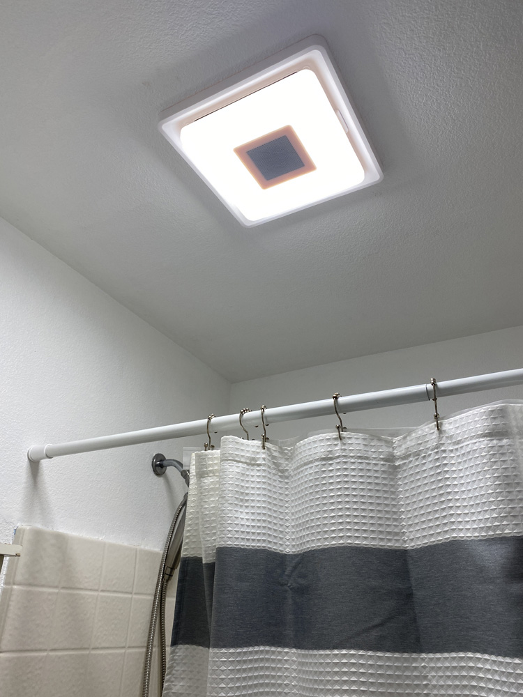 New Bathroom Fan w/ Bluetooth SpeakerJanuary 2025The boys bathroom was painted blue and decorated with monkeys when they were little and was super cute, but it really needed an update. The monkey decor was removed a long time ago, and we painted the cabinets, but we decided to paint the small toilet area white to make it feel brighter. That area was also starting to get spots of mold on the ceiling because the old fan was not working well, and they take very long, hot showers! We had Lowe's mix in a mold block with the paint, and also picked up this awesome fan with 2 night light colors and a Bluetooth speaker! We added some new accessories, like this toilet paper holder with a shelf, and we will be adding several more things to update it. It is so much nicer and looks so clean and bright! UPDATE: We finally finished painting the main part of the bathroom too! Click any image for larger view.