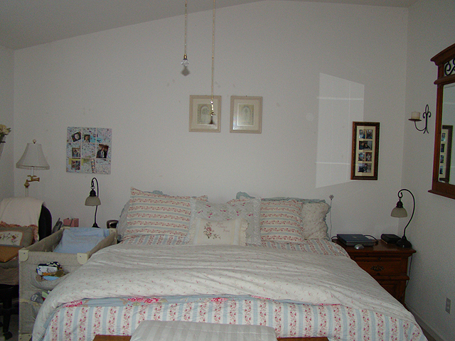 September 4, 2009Since it's a 3-day weekend, we decided to tackle painting the bedroom. Dave got the room prepped Friday night, and painted Saturday. Unfortunately, "New Avocado" is a lot brighter than we expected! Sunday we spent the morning looking at paint, and are happy with our new choice, "Hubbell House Tamarisk". Dave finished painting Sunday afternoon, and we put everything back in the room Monday. The room looks great! We have a new headboard for the bed being delivered Tuesday. Click any image for larger view.