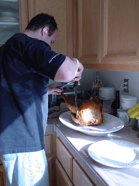 Presidents' Day weekend, February 17, 2001. Dave's parents brought their turkey fryer. Only 45 minutes to cook a 15-pound turkey! The turkey came out great -- golden and crispy on the outside and tender and juicy inside!
