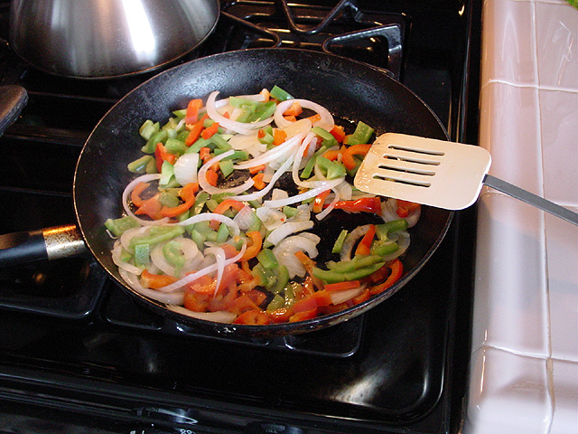 - Heat another skillet with olive oil and add bell peppers and onions. You can also add diced tomatoes. I usually add the tomatoes after the bell pepper and onions are almost cooked. You can also add jalapeno peppers if you like.