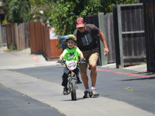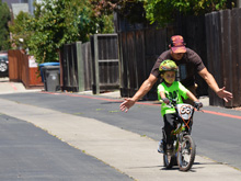 July 12, 2014First time without training wheels! He only practiced for about 20 minutes and can already ride up and down the alley on his own! Click any image for larger view.