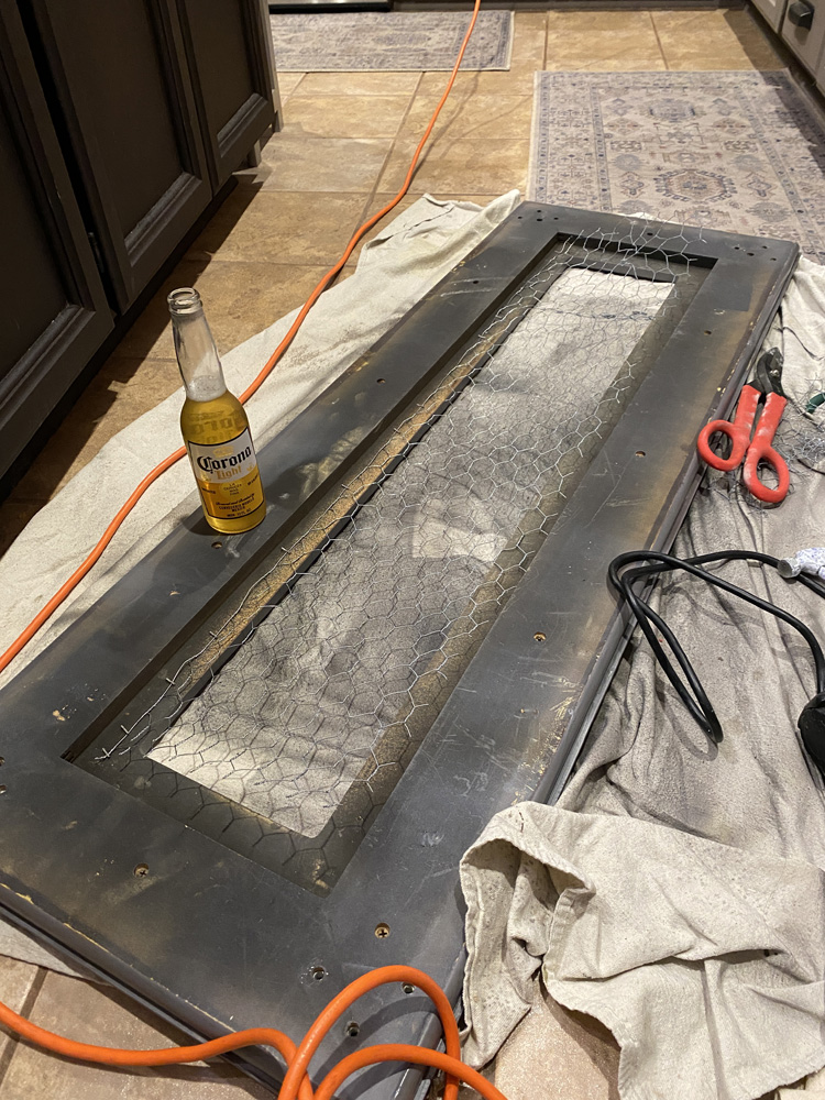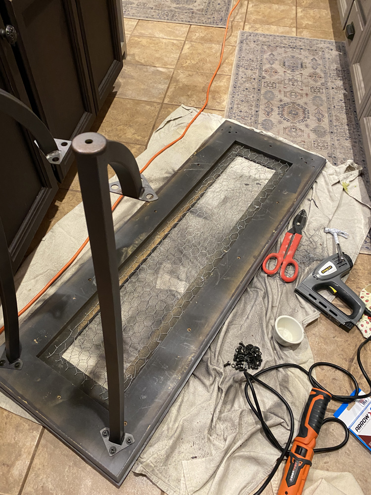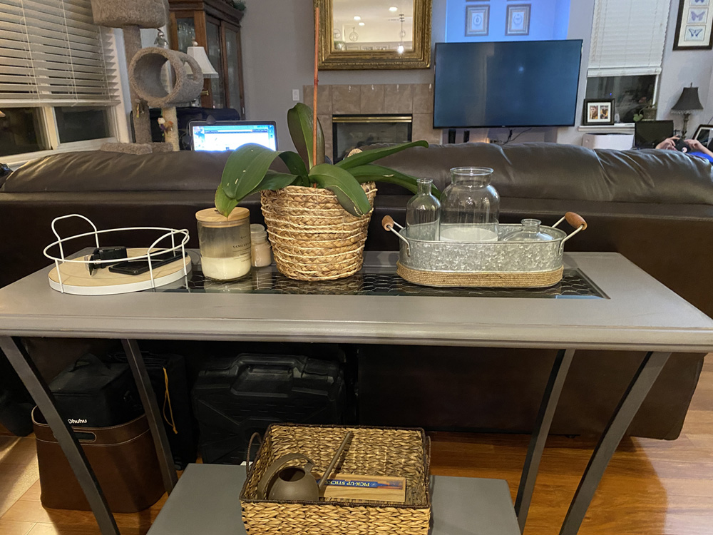 I wanted a new sofa table, but couldn't find anything I liked. I decided to try to refinish the table we had and used some chicken wire to give it a farmhouse look. As I've done with other pieces I've refinished, I first painted the table dark brown with old spray paint, then painted it a light gray chalk paint. I used sandpaper to distress it, and stapled chicken wire under the glass insert so it looked more rustic. I also had a round wooden and metal tray from the Target dollar section that was white with light wood. I ended up spray painting it and staining it a little darker and it looks so cute on this table now.