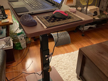 With the pandemic, it has been hard to find a nice standing desk. I want something that can stay in the living room and look nice, and anything decent is out of stock. Finally we found a really nice quality VIVO electric unit we could customize with our own custom top. It came with a base, but my mom made a new wooden base for me with rollers. She also did the top desk and even added a keyboard drawer. It has made a huge difference in aches and pains from working at the laptop!