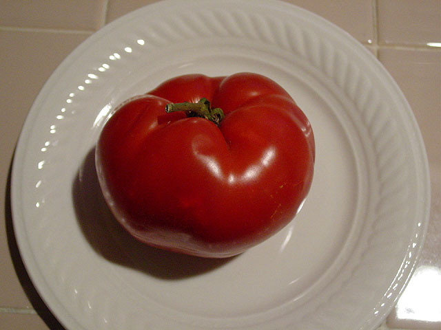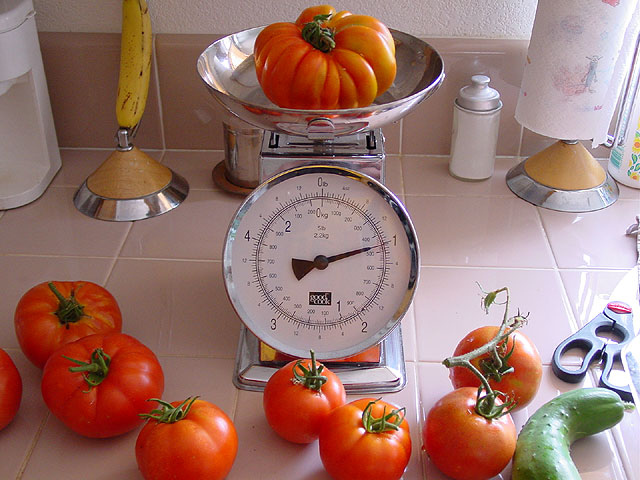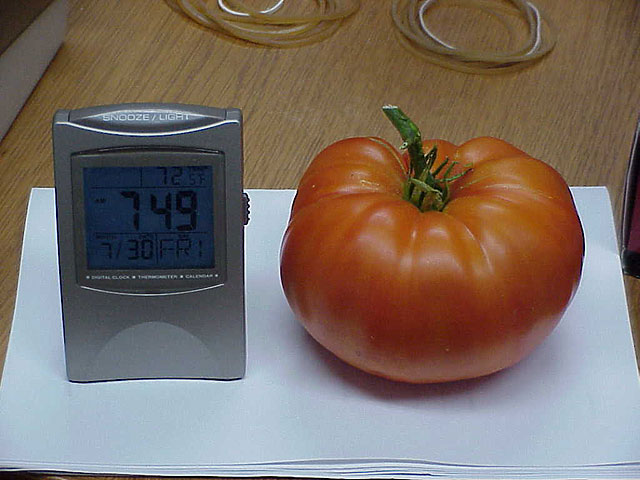 Dave's tomato was in first place at .75 lbs., but Rick's new tomato weighed in at .85 lbs. and takes over first place. As more entries are made, we will log them and their stats.