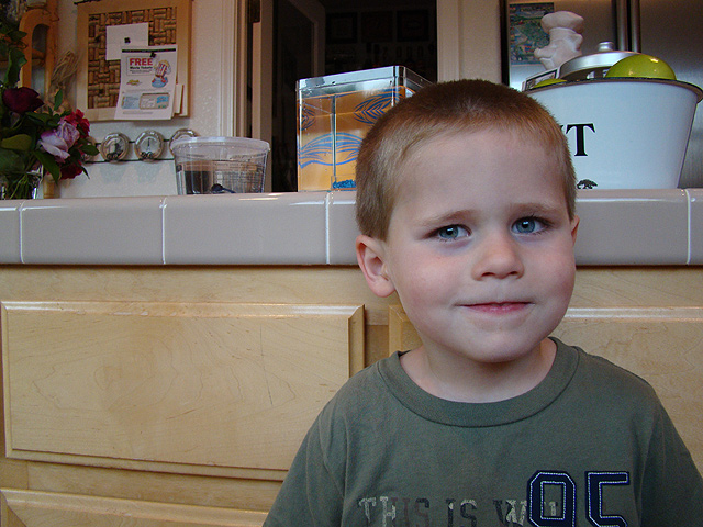 Weebo ready to go in his new tank. Hunter is excited about his new fish. Weebo in his new tank.