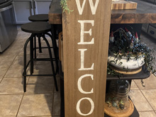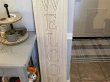Found this sign in the dollar section at Target for $5. I have been wanting a cute welcome sign to put out front. I traced the letters with a small amount of paint on an atist brush so I would have the general lines done. Once I had a clean outline, I carefully used craft paint to fill in the letters. After it was all dry, I used a fine sandpaper to scuff them a bit. I then used a walnut stain to make the whole thing darker. I went over the painted letters as well to take the brightness away and age it a little.