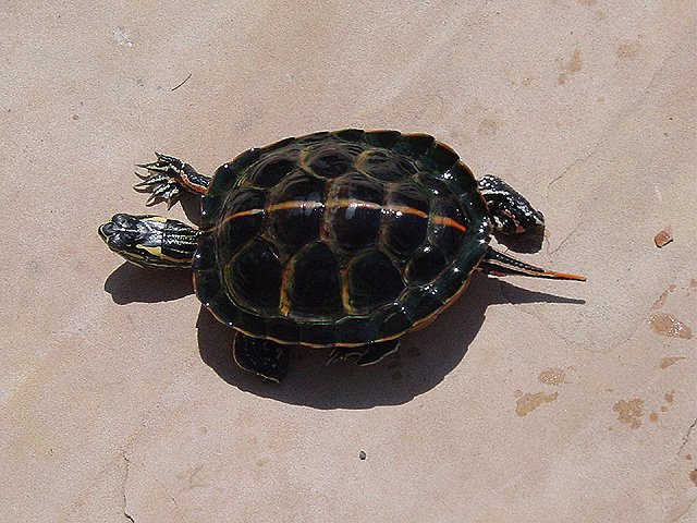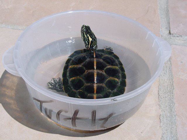 Turtle waits in his bowl while Dave cleans his tank. Size comparison to Dave's foot. Hanging out on the patio. Turtle takes a walk while he waits for his tank to be cleaned. Turtle in his tank. Turtle in his tank.