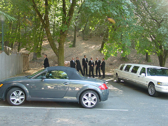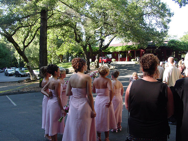 Bridesmaids after. Bridesmaids Groomsmen celebrate with champagne. Ready to go. They're off! The reception hall. Dan at the reception. Marie at the reception Dan says a few words... Groomsmen at the reception. Bridesmaids at the reception. Dan's best man, Jeff, gives his toast.