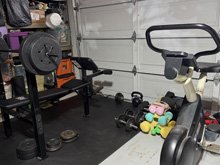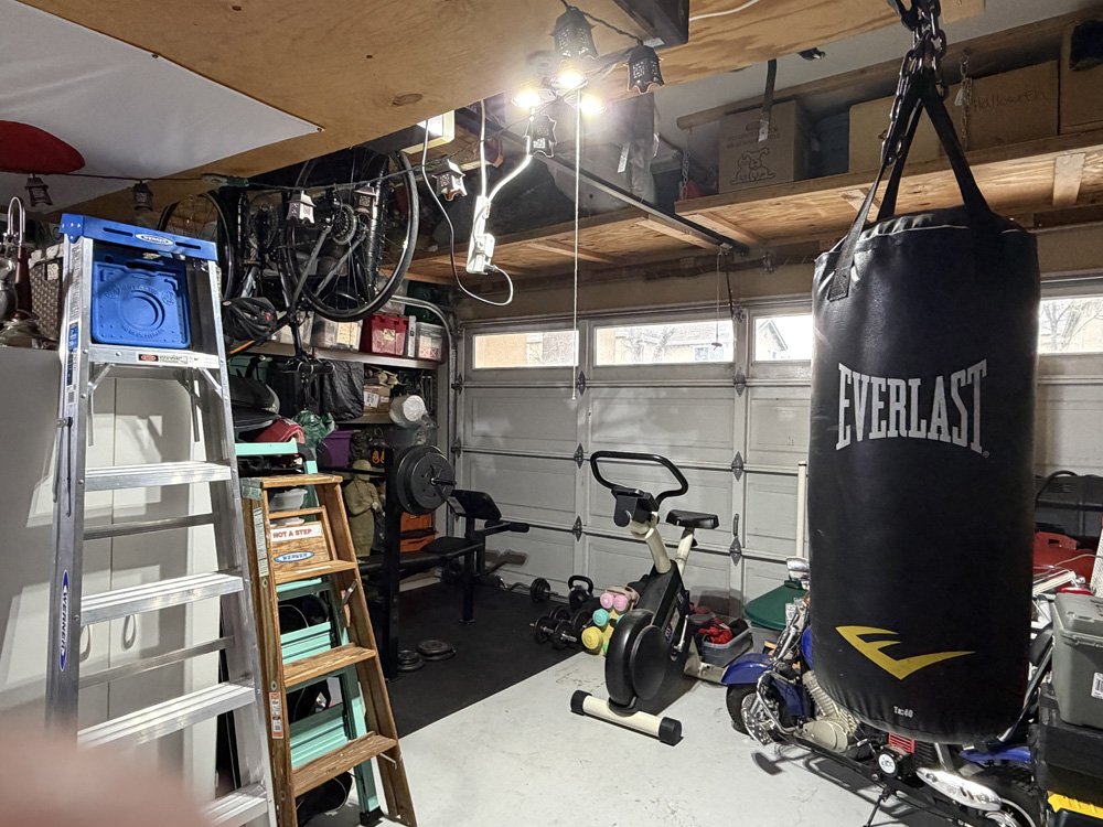 I replaced the rug in the living room, so I put the old one in the garage so Hunter had a nice area for his workout bench. I also added some extra string lights we had. It is a great spot for the boys to workout now! |