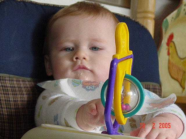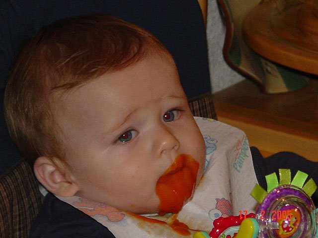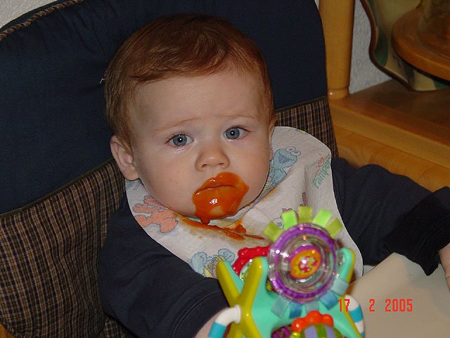 Ready to eat. Ready to eat. Eating sweet potatos. Hunter is a very messy eater... If he only knew how silly he looks... Hunter's sweet potato goatie Ready to play after dinner.