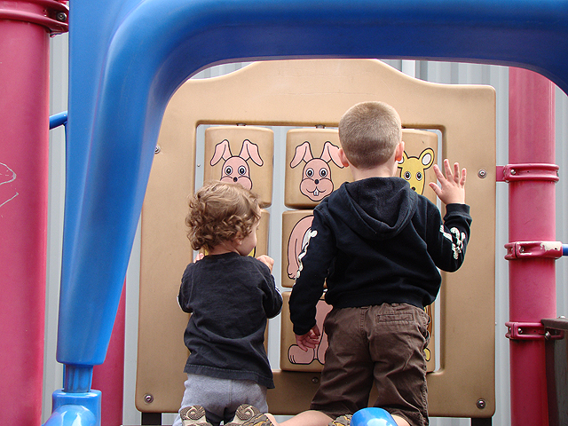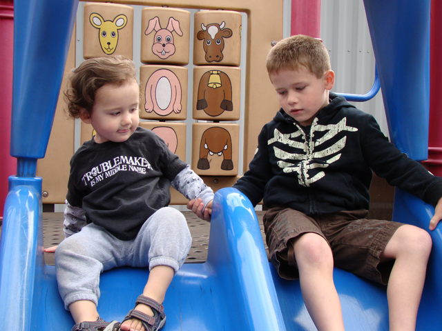 Hunter playing with Ryder at the Petaluma Village Outlets play area.