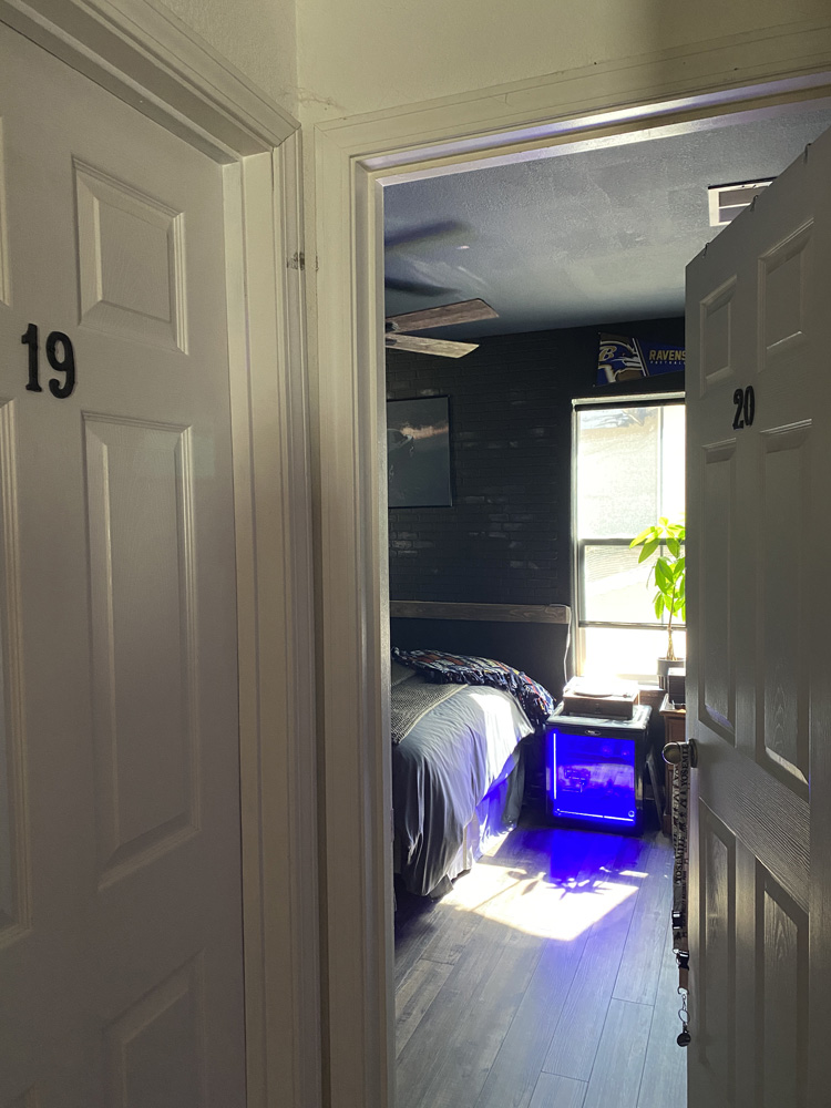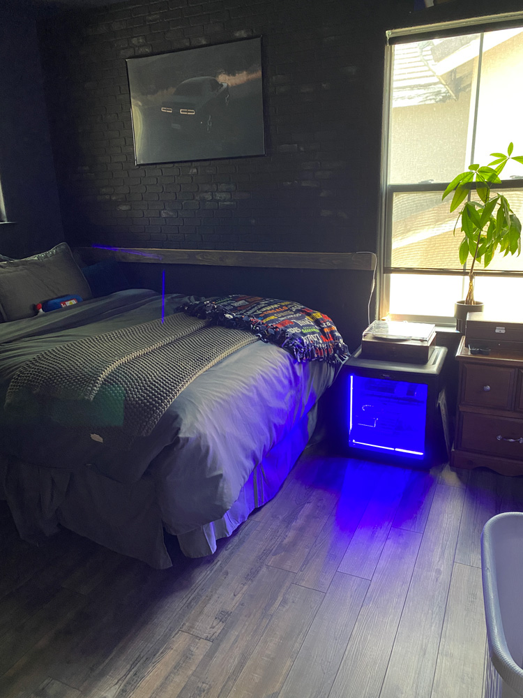 I've seen some glass-front beverage refrigerators that have the blue lighting inside. It looks super cool at night. Ryder has a small mini fridge with a glass door already, so I ordered this COB light strip on Amazon that was rated for outdoor use and is waterproof. I also used one of these strips in white behind his bed when we updated his room last month. They are so easy to stick on, and it is a pretty cool transformation!