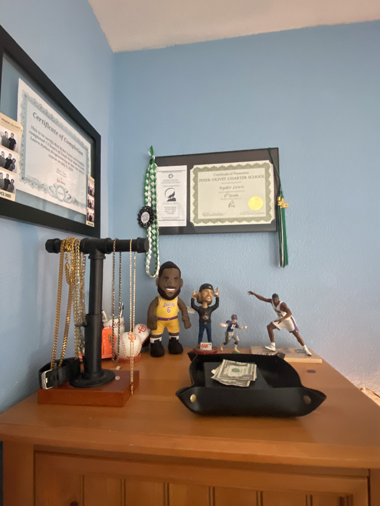 We also took down the leftover items from his sports bedroom that was very cute, but not grown up enough for a 16 year old! We had an extra set of string lights, so the cute sports lights came down and the new ones went up. We also had two poster frames leftover from Hunter's room update, so he will pick out some posters to replace the palm trees that was the generic sample photo they came with...lol.