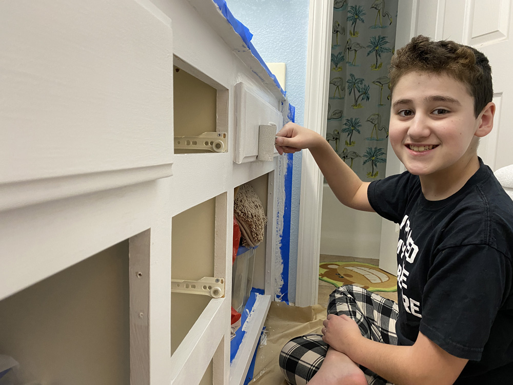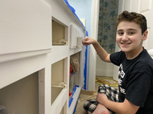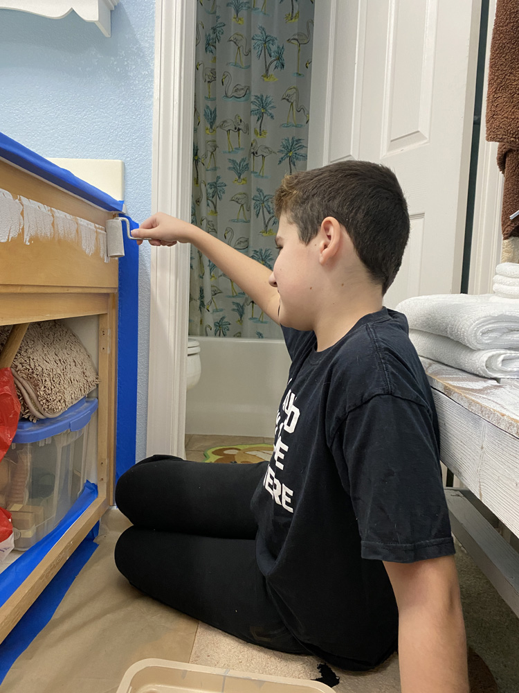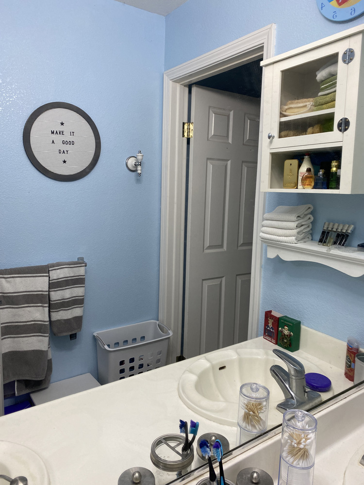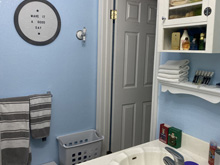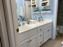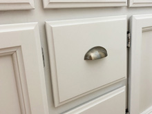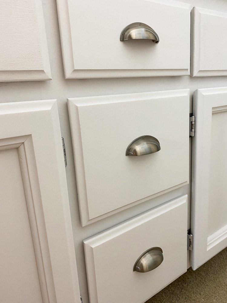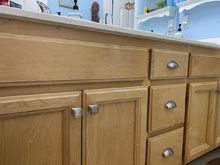 The maple cabinets were getting water damaged in the boys' bathroom so we painted them. We also added hardware since there wasn't any originally.