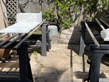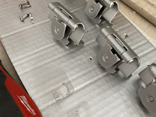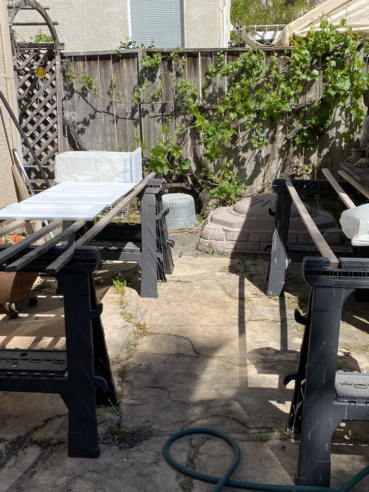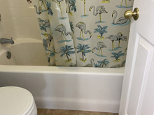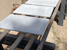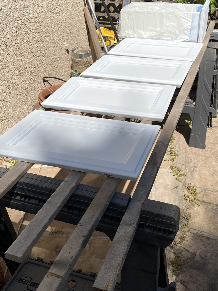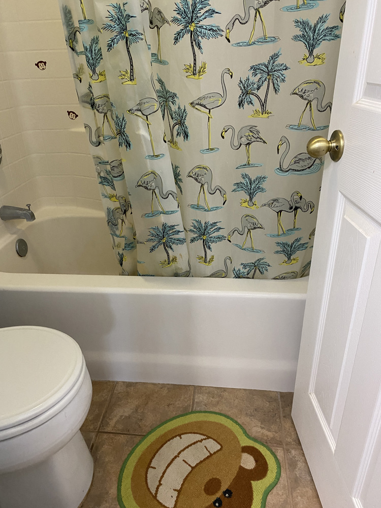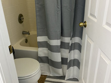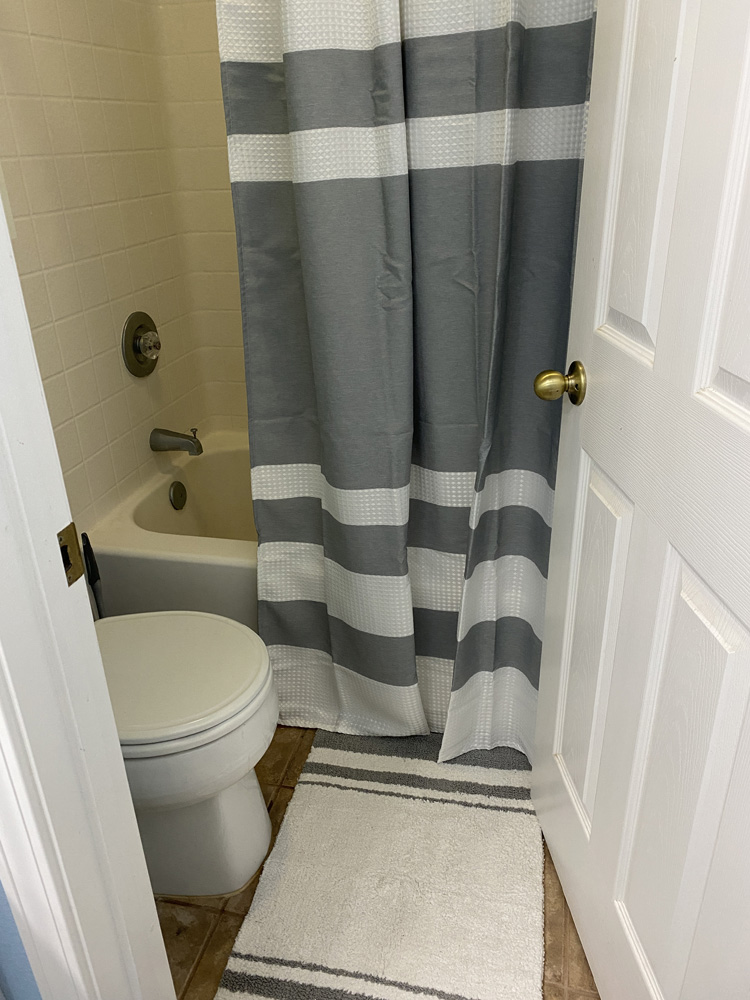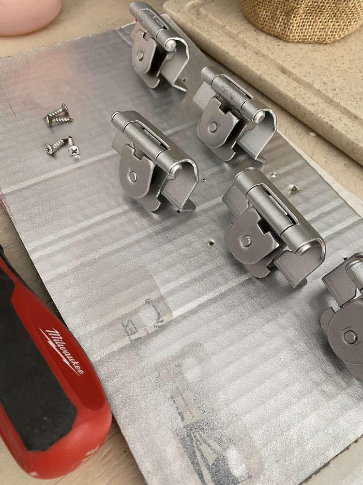 The maple cabinets were getting water damaged in the boys' bathroom so we painted them. We also added hardware since there wasn't any originally.