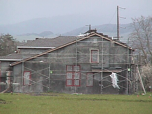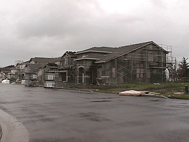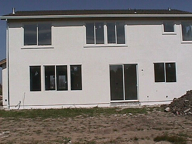 Dave's Vette in front of our very own lot! Our new street... Up it goes! On goes the stucco! Side of house. View from the street. Another side view from the street. It's getting there! Side view with stucco. Back of house. Our back yard. Back yards before the fences went up! Finally painted!