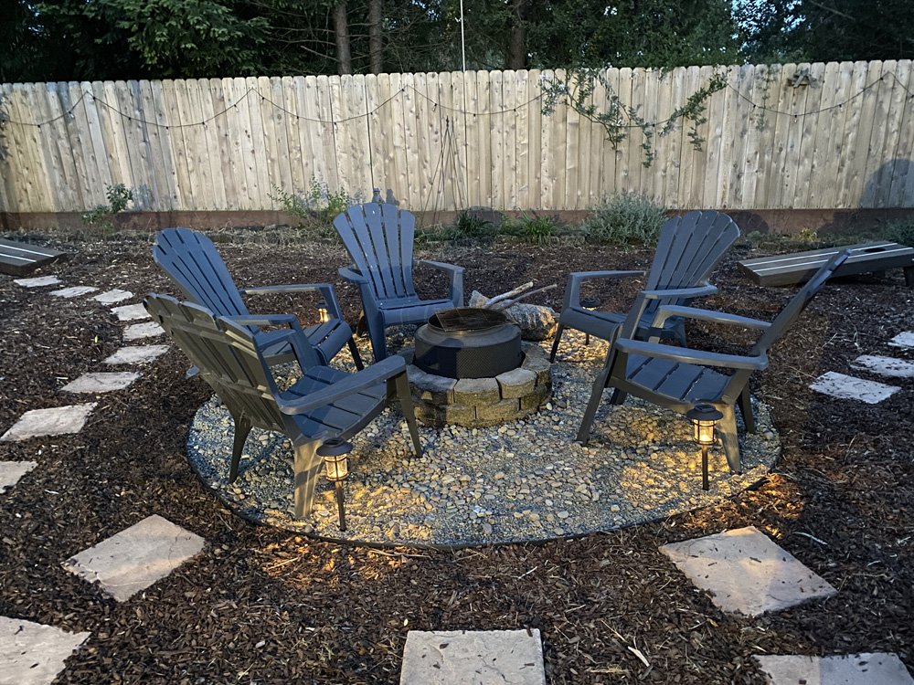 June 3, 2024We made this firepit from a washer drum last summer and the boys love having fires at night! We added some adirondack chairs and decided to create a better surface around the fire pit with gravel. We added some solar lights and we love it!