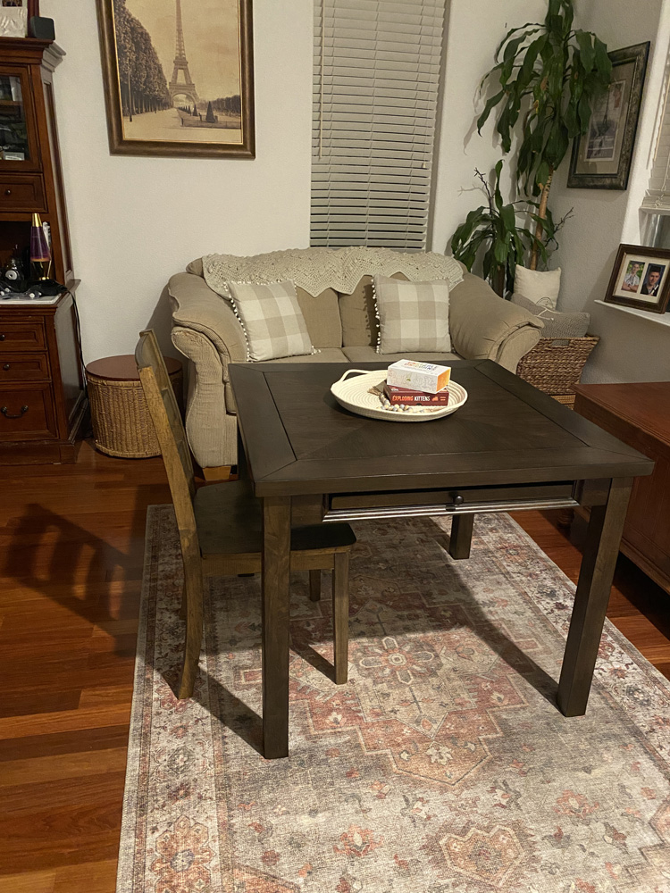 Game/Card Table 2023We found this awesome game table at Macy's on sale for 49.00 from 399.00! I'd never pay 399.00 for a small table, but the price was right and it's solid wood and made really well. The top reverses to the green felt card table. It will be great when the boys have friends over because they play card games all the time.