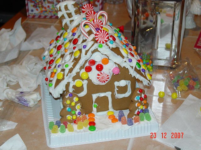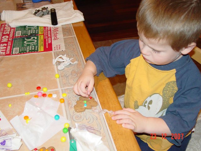 Hunter ready to work on the gingerbread house. Gingerbread house kit Hunter being silly Hunter Hunter Hunter decorates a tree Finished Finished