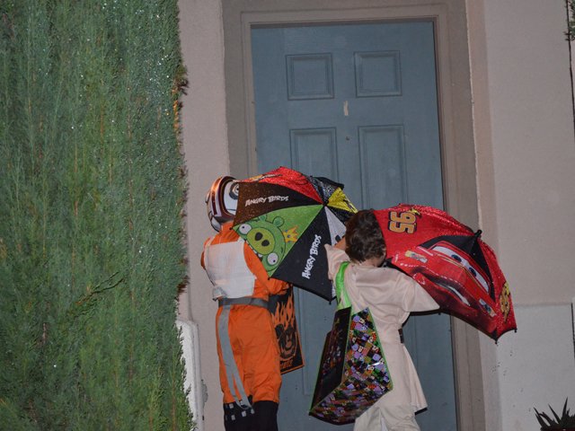 October 31, 2012The rain put a damper on things, but the boys still have fun trick-or-treating Halloween night! Click any image for larger view.