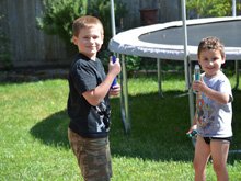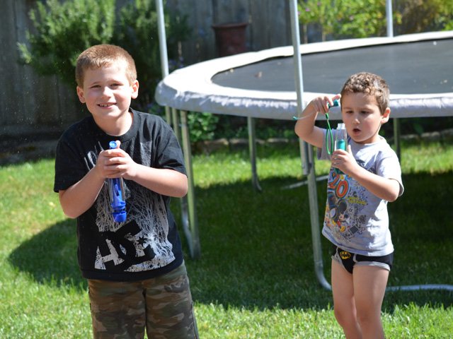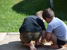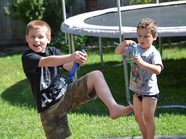 It's not hard to amuse these boys -- happily spraying water on bugs.