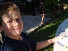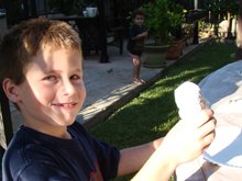 Hunter using some homemade tools to try to see the crescent-shaped sun from the solar eclipse. Little did he know Ryder was running around behind him with crescent shadows cast all over his legs!