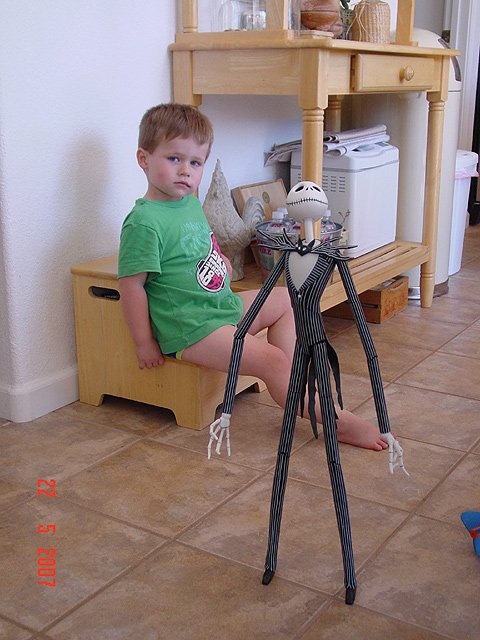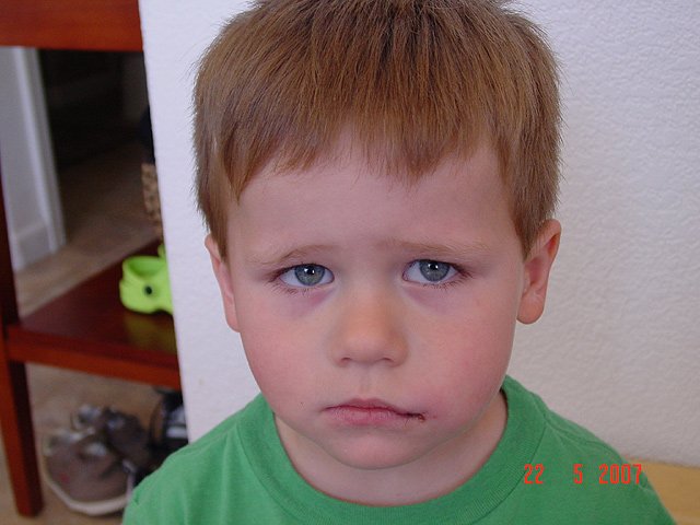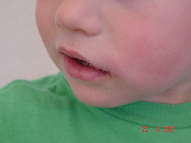May 22, 2007Hunter's first real injury. He stumbled and fell against the coffee table and needed two stitches. Click any image for larger view.