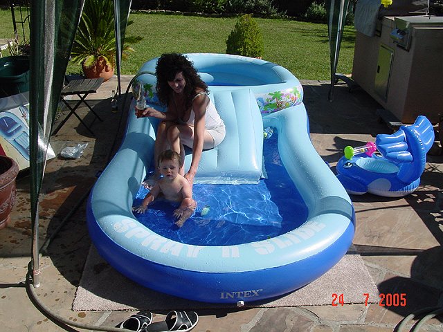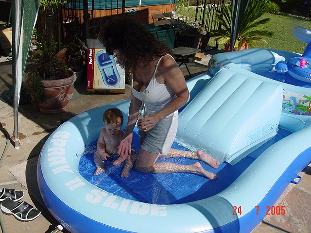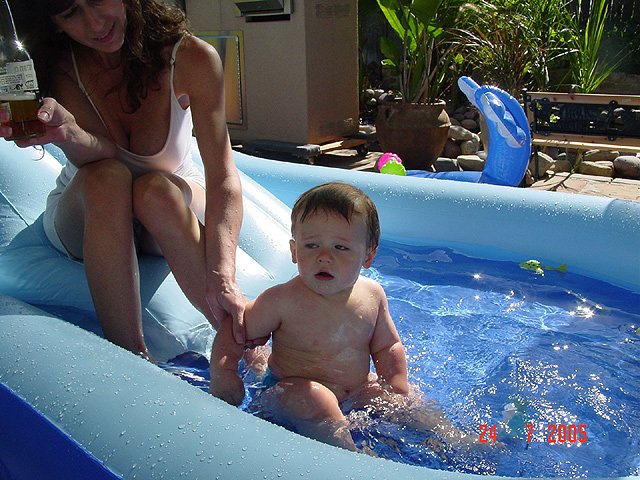 Hunter loves his swimming pool and his new stroller/bike trailer.