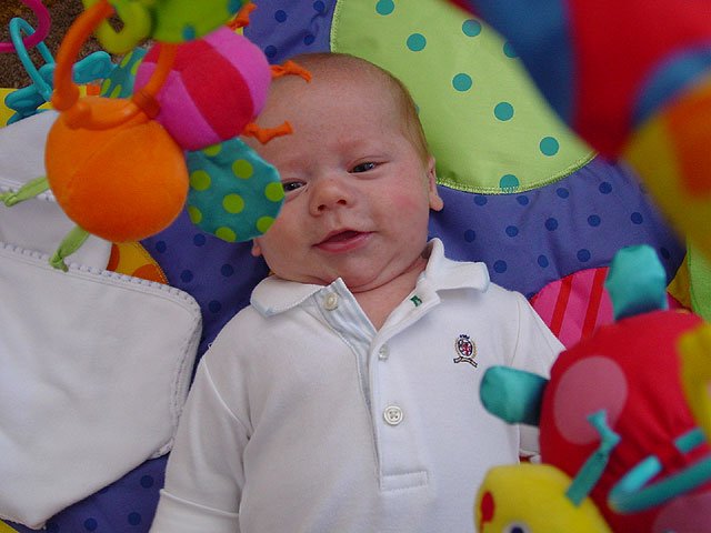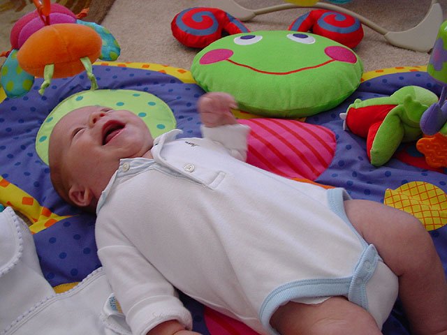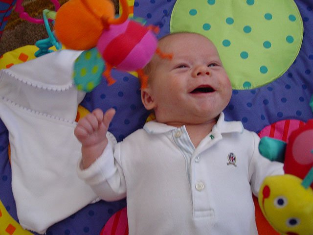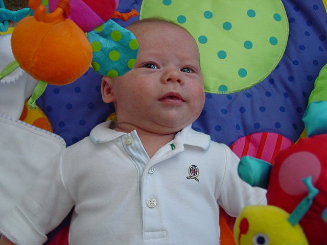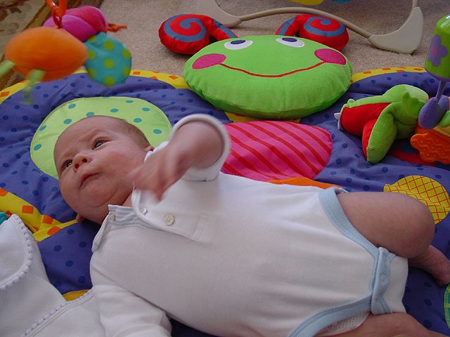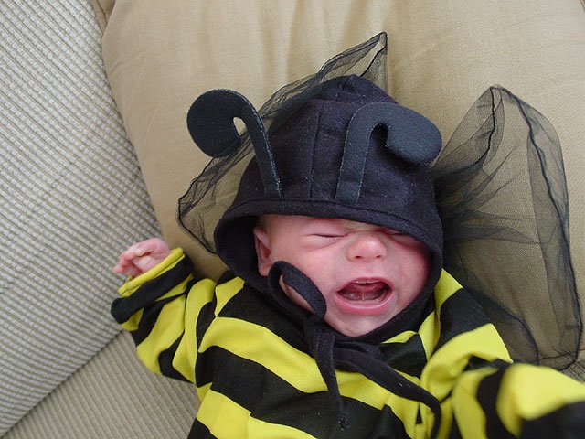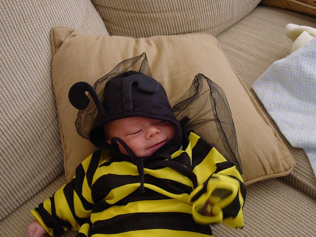 Hunter is over 12 lbs. now and becoming more entertained with new things every day. His favorite thing is still his butterfly mat where he lies and swats at his toys. He already has a bumble bee costume for Halloween and we tried it on for size today. :-)