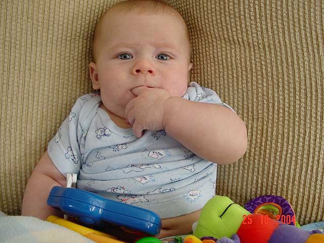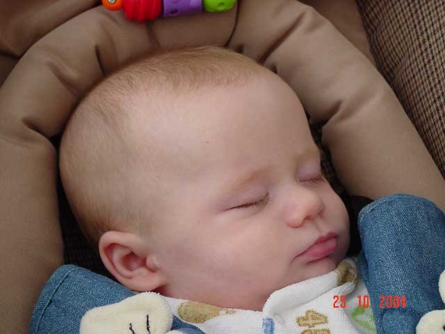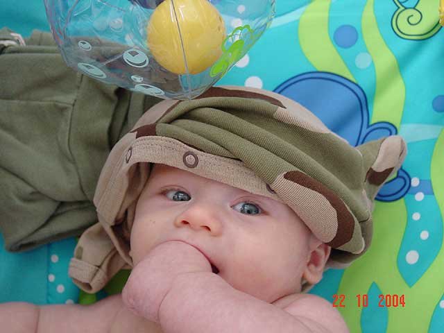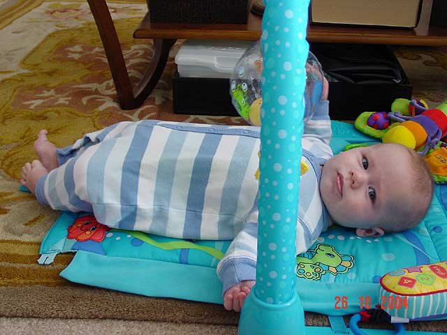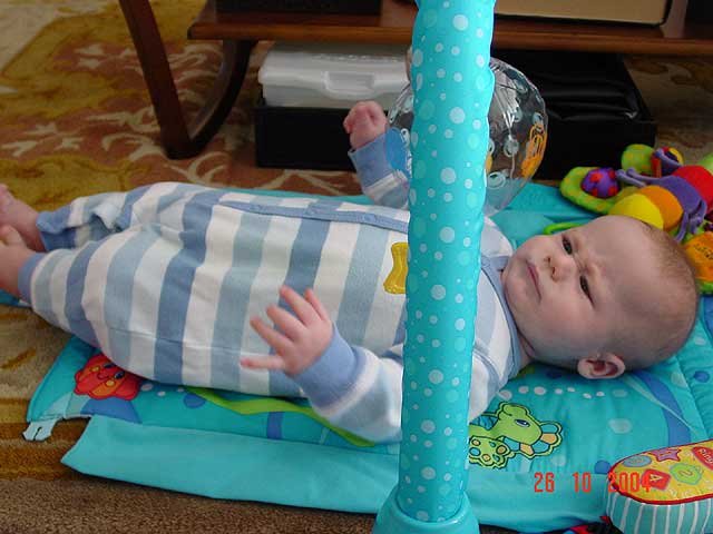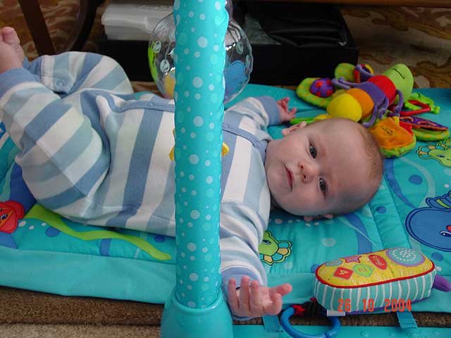 Hunter being silly... It's hard to dress a baby with his hand in his mouth. Sucking on his fingers again. Hunter playing on his mat. Playing on his mat. Hunter gets serious. Sleeping Sleeping