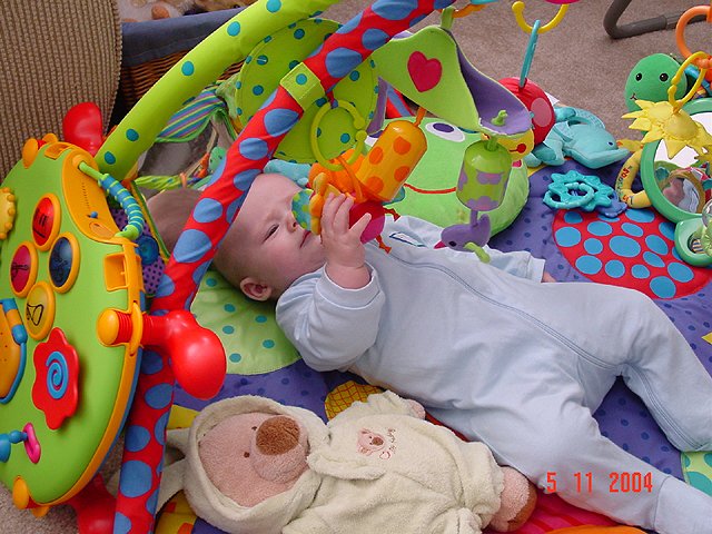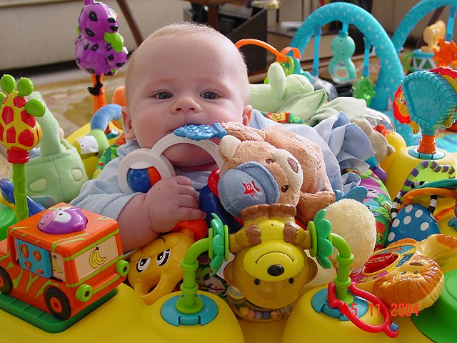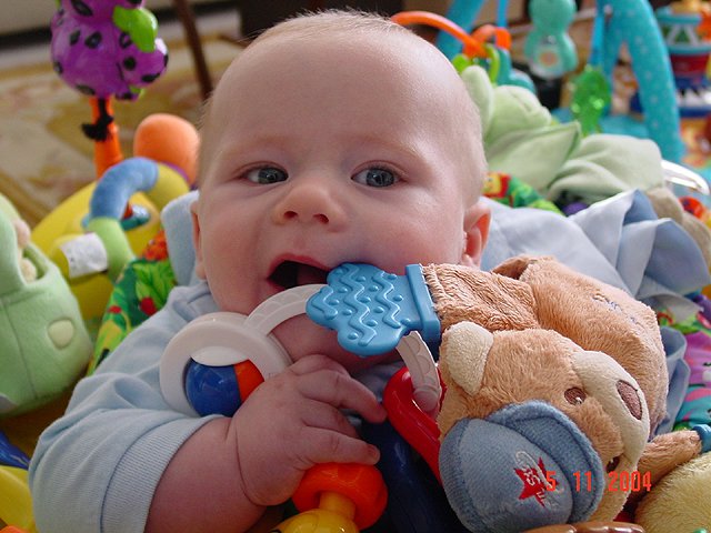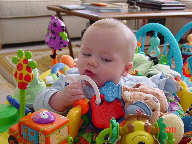 Hunter in the saucer again. Hunter teething on everything! Hunter with lots of toys... Hunter chewing on his toys. Hunter playing. Hunter can't wait until he can sit up on his own. Naked baby.