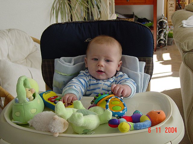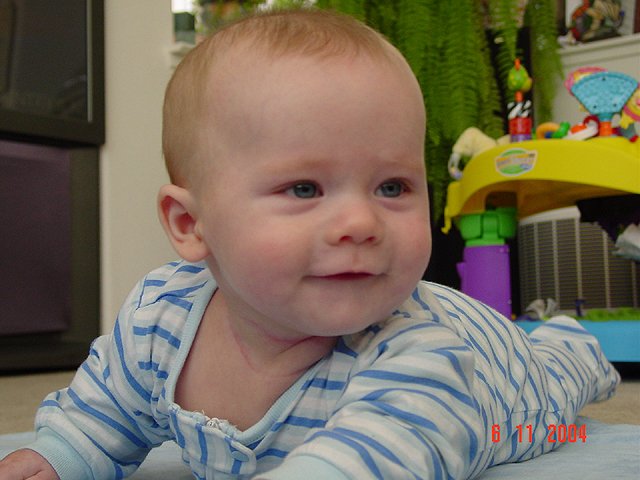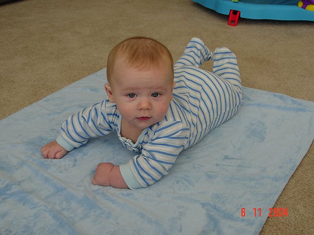 Hunter with his basketball. Hunter with his basketball. Hunter trying out the highchair. Hunter gets his belly time. Hunter can't wait to start crawling! Hunter likes belly time... Silly grin...