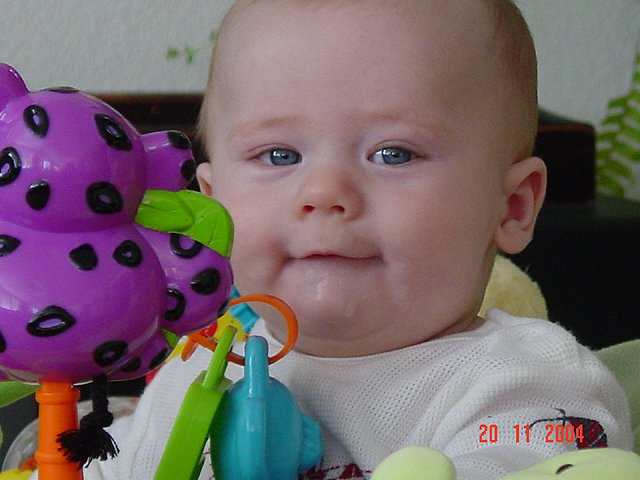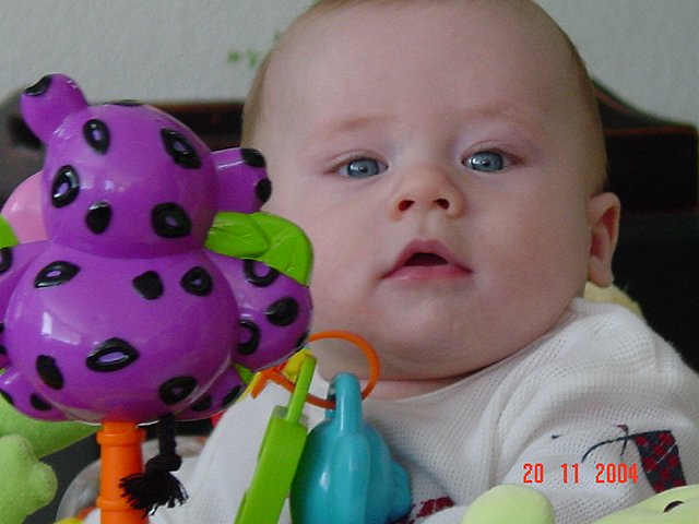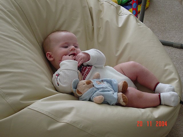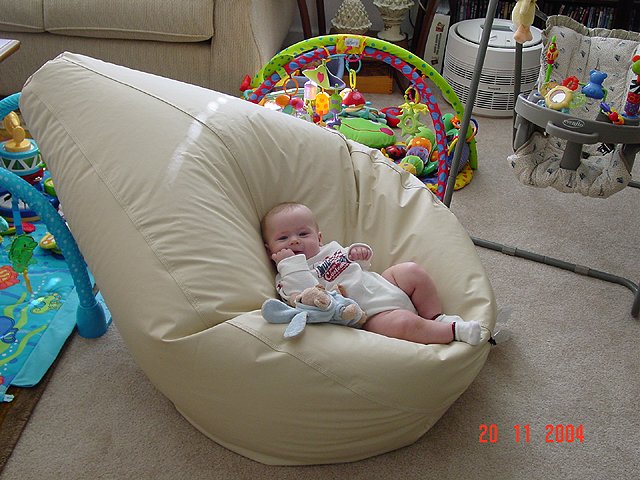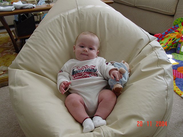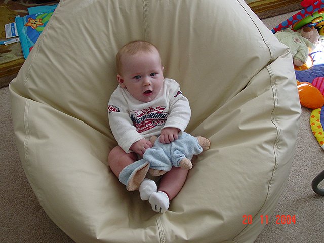 November 20, 2004Dave got a new bean bag to sit on the floor watching TV with Hunter. Looks like Hunter thinks the bean bag should be just for him! Click any image for larger view.