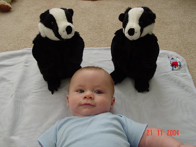 November 21, 2004Hunter is 17.5 lbs now! We bought him some new stuffed toys to remind him of his favorite website, www.badgerbadgerbadger.com. Daddy plays it for him on the computer when he can't sleep... Click any image for larger view.