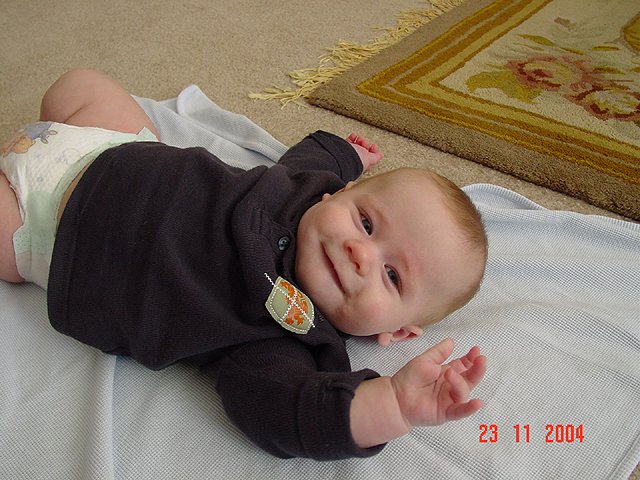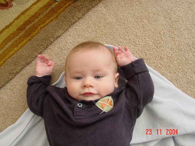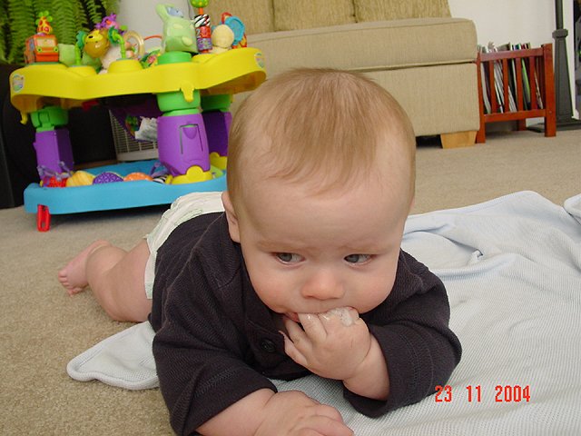 Hunter playing on his belly. Hunter is proud of himself every time he rolls over. Chubby legs! That's a lot of drool... Showing a smile. Hunter being silly. Hunter being silly. Hunter being silly. All that playing has worn him out.
