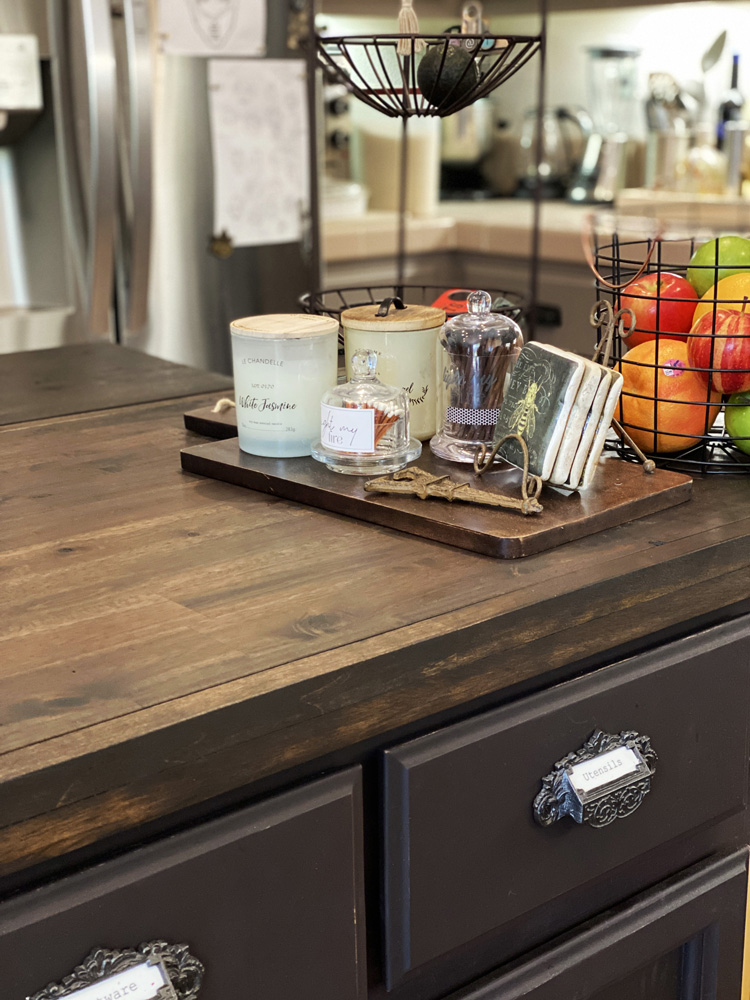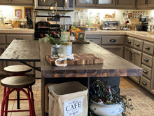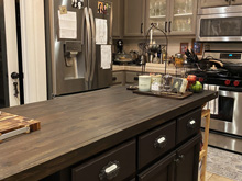March 31, 2022A while back, we tore off the tile from our kitchen island. We didn't have anything to put on it yet, so I gave the plywood a faux marble finish...lol. We were pricing quartz and other options, and found this great acacia butcher block at Home Depot. we installed it, but it was the same width of the island so there was no overhang. My mom helped me add trim and finish it to match. We also used table-leaf hinges to add an acacia extension. Click any image for larger view. |